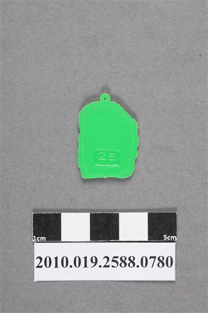 1.本物件為怪物頭像尪仔仙。硬質塑膠材質,扁平,單一不透明綠色,單面浮雕圖案。正面圖案為臉上只有眼睛的怪物頭像,額頭處有1顆大眼睛,其他地方布滿小眼睛。頭頂有小吊環,背面有26之陽刻字樣,是系列尪仔仙。