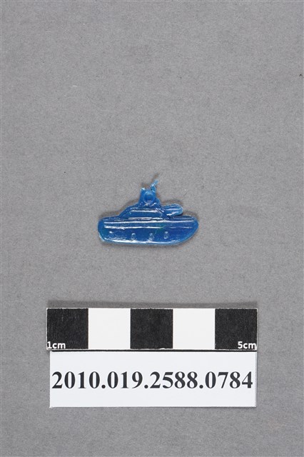 1.本物件為坦克車尪仔仙。硬質塑膠材質,扁平,單一不透明藍色,雙面浮雕圖案,兩面圖案相同。圖案為坦克車側面,可見大砲管和履帶。車頂有小吊環。
