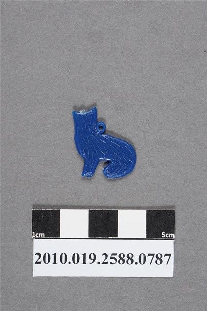 1.本物件為狐狸尪仔仙。硬質塑膠材質,扁平,單一不透明藍色,雙面浮雕圖案。正面圖案為坐在地上的狐狸,前腳伸直著地,撐起上半身,尾巴彎曲。有小吊環。