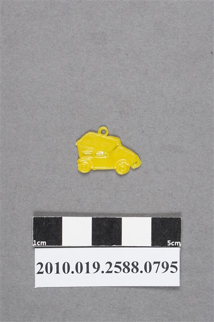 1.本物件為汽車尪仔仙。硬質塑膠材質,扁平,單一不透明黃色,雙面浮雕圖案,兩面圖案相同。圖案為沒有後車箱的汽車,車廂方正,為復古車型。車頂有小吊環。
