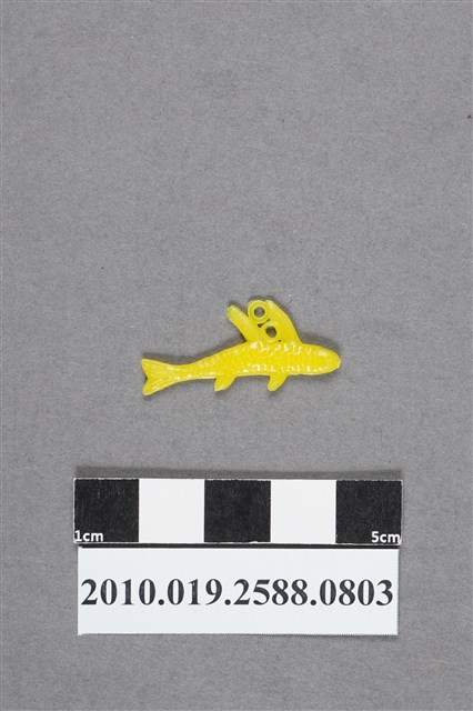 1.本物件為小魚尪仔仙。硬質塑膠材質,扁平,單一不透明黃色,雙面浮雕圖案,兩面圖案相同。圖案為身材細長的魚,有胸、腹、背和尾鰭,有2片背鰭,身上有鱗片。有小吊環。2.尪仔仙尺寸大致可分成小、中、大型,小型約長2-5公分,中型約長8-15公分,顏色以單色為主。有些大型的則可長達30公分左右,以菩薩、神仙和民間傳說故事人物等造型為主,塗上金銀紅黃彩漆等亮色。1960、70年代的尪仔仙多以民間傳說故事、歌仔戲、布袋戲人物為造型。1980年代改以卡通、電玩、漫畫人物造型為主。常見玩法之一為兩人(或多人)各持一只尪仔仙,輪流用手指彈射,看誰的尪仔仙先疊在對方上面,便可贏得對方用來對戰或是約定的尪仔仙。