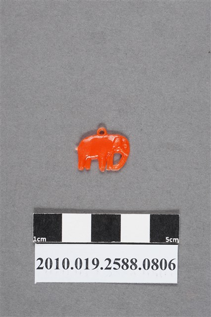 1.本物件為大象尪仔仙。硬質塑膠材質,扁平,單一不透明橘紅色,雙面浮雕圖案,兩面圖案相同。圖案為站立的大象,長鼻碰地,可見象耳和象牙。背上有小吊環。2.尪仔仙尺寸大致可分成小、中、大型,小型約長2-5公分,中型約長8-15公分,顏色以單色為主。有些大型的則可長達30公分左右,以菩薩、神仙和民間傳說故事人物等造型為主,塗上金銀紅黃彩漆等亮色。1960、70年代的尪仔仙多以民間傳說故事、歌仔戲、布袋戲人物為造型。1980年代改以卡通、電玩、漫畫人物造型為主。常見玩法之一為兩人(或多人)各持一只尪仔仙,輪流用手指彈射,看誰的尪仔仙先疊在對方上面,便可贏得對方用來對戰或是約定的尪仔仙。