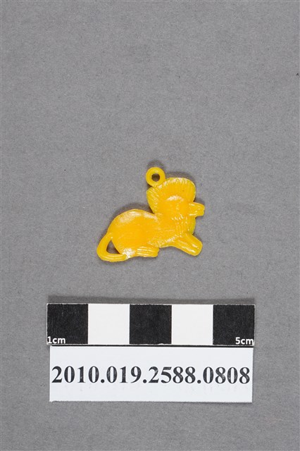 1.本物件為獅子尪仔仙。硬質塑膠材質,扁平,單一不透明黃色,雙面浮雕圖案,兩面圖案相同。圖案為趴在地上的獅子,嘴型略凸出,可見鬃毛和尾巴。背上有小吊環。2.尪仔仙尺寸大致可分成小、中、大型,小型約長2-5公分,中型約長8-15公分,顏色以單色為主。有些大型的則可長達30公分左右,以菩薩、神仙和民間傳說故事人物等造型為主,塗上金銀紅黃彩漆等亮色。1960、70年代的尪仔仙多以民間傳說故事、歌仔戲、布袋戲人物為造型。1980年代改以卡通、電玩、漫畫人物造型為主。常見玩法之一為兩人(或多人)各持一只尪仔仙,輪流用手指彈射,看誰的尪仔仙先疊在對方上面,便可贏得對方用來對戰或是約定的尪仔仙。