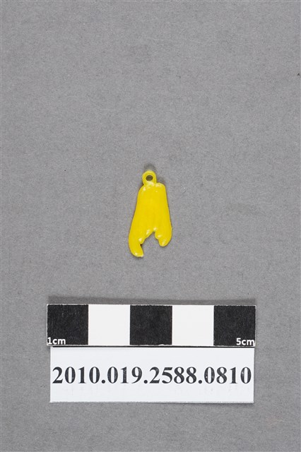 1.本物件為黃色佛手瓜尪仔仙。硬質塑膠材質,扁平,單一不透明黃色,雙面浮雕圖案,兩面圖案相同。正面圖案為佛手瓜,表面有條狀紋路。有小吊環。2.尪仔仙尺寸大致可分成小、中、大型,小型約長2-5公分,中型約長8-15公分,顏色以單色為主。有些大型的則可長達30公分左右,以菩薩、神仙和民間傳說故事人物等造型為主,塗上金銀紅黃彩漆等亮色。1960、70年代的尪仔仙多以民間傳說故事、歌仔戲、布袋戲人物為造型。1980年代改以卡通、電玩、漫畫人物造型為主。常見玩法之一為兩人(或多人)各持一只尪仔仙,輪流用手指彈射,看誰的尪仔仙先疊在對方上面,便可贏得對方用來對戰或是約定的尪仔仙。