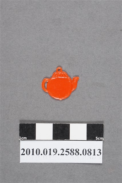 1.本物件為水壺尪仔仙。硬質塑膠材質,扁平,單一不透明橘紅色,雙面浮雕圖案,兩面圖案相同。圖案為圓身水壺,可見壺嘴和把手,壺蓋上有條紋。有小吊環。2.尪仔仙尺寸大致可分成小、中、大型,小型約長2-5公分,中型約長8-15公分,顏色以單色為主。有些大型的則可長達30公分左右,以菩薩、神仙和民間傳說故事人物等造型為主,塗上金銀紅黃彩漆等亮色。1960、70年代的尪仔仙多以民間傳說故事、歌仔戲、布袋戲人物為造型。1980年代改以卡通、電玩、漫畫人物造型為主。常見玩法之一為兩人(或多人)各持一只尪仔仙,輪流用手指彈射,看誰的尪仔仙先疊在對方上面,便可贏得對方用來對戰或是約定的尪仔仙。
