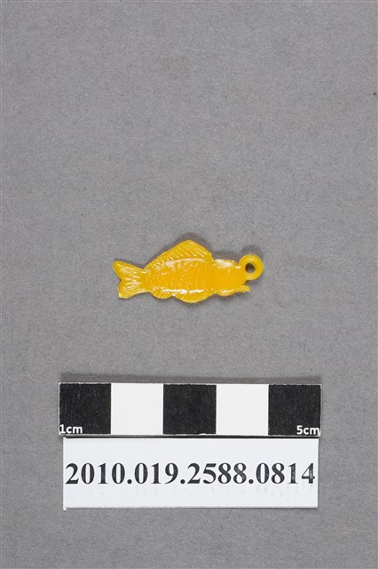 1.本物件為小魚尪仔仙。硬質塑膠材質,扁平,單一不透明黃色,雙面浮雕圖案,兩面圖案相同。圖案為鰭形狀特殊的魚,有胸、腹、背和尾鰭,背鰭長,腹和胸鰭連在一起,身上有鱗片。有小吊環。2.尪仔仙尺寸大致可分成小、中、大型,小型約長2-5公分,中型約長8-15公分,顏色以單色為主。有些大型的則可長達30公分左右,以菩薩、神仙和民間傳說故事人物等造型為主,塗上金銀紅黃彩漆等亮色。1960、70年代的尪仔仙多以民間傳說故事、歌仔戲、布袋戲人物為造型。1980年代改以卡通、電玩、漫畫人物造型為主。常見玩法之一為兩人(或多人)各持一只尪仔仙,輪流用手指彈射,看誰的尪仔仙先疊在對方上面,便可贏得對方用來對戰或是約定的尪仔仙。