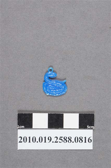 1.本物件為蛇尪仔仙。硬質塑膠材質,扁平,單一不透明藍色,雙面浮雕圖案,兩面圖案相同。圖案為身體蜷曲成圈狀的蛇,蛇頭立起,身體有鱗片。頭頂有小吊環。