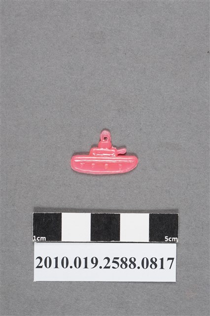 1.本物件為坦克車尪仔仙。硬質塑膠材質,扁平,單一不透明粉紅色,雙面浮雕圖案,兩面圖案相同。圖案為坦克車側面,可見大砲管和履帶。車頂有小吊環。2.尪仔仙尺寸大致可分成小、中、大型,小型約長2-5公分,中型約長8-15公分,顏色以單色為主。有些大型的則可長達30公分左右,以菩薩、神仙和民間傳說故事人物等造型為主,塗上金銀紅黃彩漆等亮色。1960、70年代的尪仔仙多以民間傳說故事、歌仔戲、布袋戲人物為造型。1980年代改以卡通、電玩、漫畫人物造型為主。常見玩法之一為兩人(或多人)各持一只尪仔仙,輪流用手指彈射,看誰的尪仔仙先疊在對方上面,便可贏得對方用來對戰或是約定的尪仔仙。