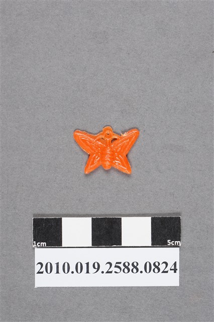 1.本物件為蝴蝶尪仔仙。硬質塑膠材質,扁平,單一不透明橘色,雙面浮雕圖案,兩面圖案相同。圖案為張開翅膀的蝴蝶,軀幹上有橫條紋和觸角。有小吊環。2.尪仔仙尺寸大致可分成小、中、大型,小型約長2-5公分,中型約長8-15公分,顏色以單色為主。有些大型的則可長達30公分左右,以菩薩、神仙和民間傳說故事人物等造型為主,塗上金銀紅黃彩漆等亮色。1960、70年代的尪仔仙多以民間傳說故事、歌仔戲、布袋戲人物為造型。1980年代改以卡通、電玩、漫畫人物造型為主。常見玩法之一為兩人(或多人)各持一只尪仔仙,輪流用手指彈射,看誰的尪仔仙先疊在對方上面,便可贏得對方用來對戰或是約定的尪仔仙。