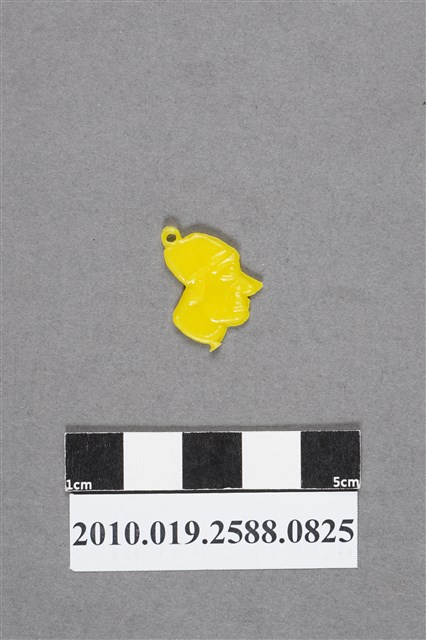 1.本物件為戴帽頭像尪仔仙。硬質塑膠材質,扁平,單一不透明黃色,雙面浮雕圖案。圖案為戴著帽子的側面頭像,有眼睛、鼻子、嘴巴和耳朵,帽子底下有頭髮。帽頂上有小吊環。2.尪仔仙尺寸大致可分成小、中、大型,小型約長2-5公分,中型約長8-15公分,顏色以單色為主。有些大型的則可長達30公分左右,以菩薩、神仙和民間傳說故事人物等造型為主,塗上金銀紅黃彩漆等亮色。1960、70年代的尪仔仙多以民間傳說故事、歌仔戲、布袋戲人物為造型。1980年代改以卡通、電玩、漫畫人物造型為主。常見玩法之一為兩人(或多人)各持一只尪仔仙,輪流用手指彈射,看誰的尪仔仙先疊在對方上面,便可贏得對方用來對戰或是約定的尪仔仙。
