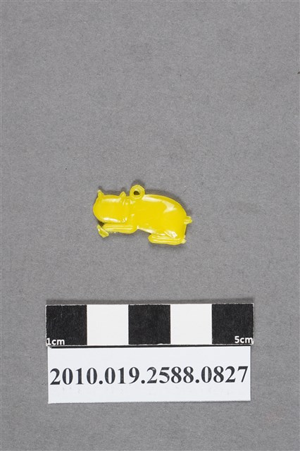 1.本物件為貓咪尪仔仙。硬質塑膠材質,扁平,單一不透明黃色,雙面浮雕圖案。正面圖案為有項圈的貓咪趴在地上,尾巴短。貓背上有小吊環。2.尪仔仙尺寸大致可分成小、中、大型,小型約長2-5公分,中型約長8-15公分,顏色以單色為主。有些大型的則可長達30公分左右,以菩薩、神仙和民間傳說故事人物等造型為主,塗上金銀紅黃彩漆等亮色。1960、70年代的尪仔仙多以民間傳說故事、歌仔戲、布袋戲人物為造型。1980年代改以卡通、電玩、漫畫人物造型為主。常見玩法之一為兩人(或多人)各持一只尪仔仙,輪流用手指彈射,看誰的尪仔仙先疊在對方上面,便可贏得對方用來對戰或是約定的尪仔仙。