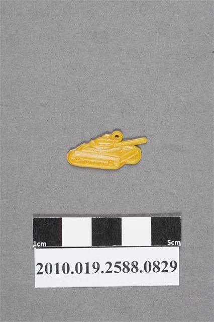 1.本物件為坦克車尪仔仙。硬質塑膠材質,扁平,單一不透明黃色,雙面浮雕圖案,兩面圖案相同。圖案為坦克車斜側面,可見大砲管、履帶以及車頭部位。車頂有小吊環。2.尪仔仙尺寸大致可分成小、中、大型,小型約長2-5公分,中型約長8-15公分,顏色以單色為主。有些大型的則可長達30公分左右,以菩薩、神仙和民間傳說故事人物等造型為主,塗上金銀紅黃彩漆等亮色。1960、70年代的尪仔仙多以民間傳說故事、歌仔戲、布袋戲人物為造型。1980年代改以卡通、電玩、漫畫人物造型為主。常見玩法之一為兩人(或多人)各持一只尪仔仙,輪流用手指彈射,看誰的尪仔仙先疊在對方上面,便可贏得對方用來對戰或是約定的尪仔仙。