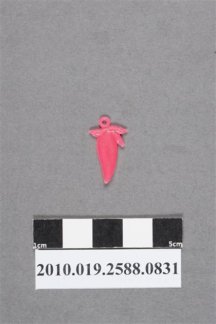 1.本物件為辣椒尪仔仙。硬質塑膠材質,扁平,單一不透明桃紅色,雙面浮雕圖案,兩面圖案相同。圖案為上粗下細,最下面為尖端的果實形狀,有3片葉子,可見葉脈。有小吊環。2.尪仔仙尺寸大致可分成小、中、大型,小型約長2-5公分,中型約長8-15公分,顏色以單色為主。有些大型的則可長達30公分左右,以菩薩、神仙和民間傳說故事人物等造型為主,塗上金銀紅黃彩漆等亮色。1960、70年代的尪仔仙多以民間傳說故事、歌仔戲、布袋戲人物為造型。1980年代改以卡通、電玩、漫畫人物造型為主。常見玩法之一為兩人(或多人)各持一只尪仔仙,輪流用手指彈射,看誰的尪仔仙先疊在對方上面,便可贏得對方用來對戰或是約定的尪仔仙。