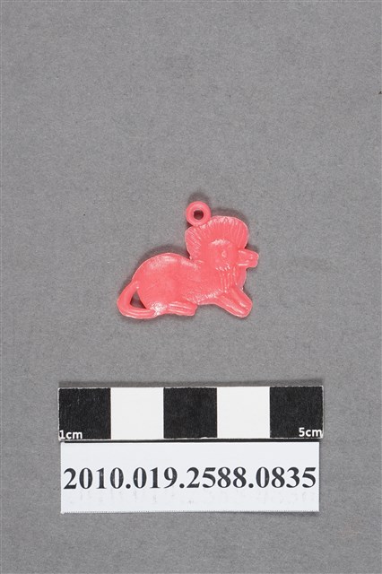 1.本物件為獅子尪仔仙。硬質塑膠材質,扁平,單一不透明粉紅色,雙面浮雕圖案,兩面圖案相同。圖案為趴在地上的獅子,嘴型略凸出,可見鬃毛和尾巴。背上有小吊環。2.尪仔仙尺寸大致可分成小、中、大型,小型約長2-5公分,中型約長8-15公分,顏色以單色為主。有些大型的則可長達30公分左右,以菩薩、神仙和民間傳說故事人物等造型為主,塗上金銀紅黃彩漆等亮色。1960、70年代的尪仔仙多以民間傳說故事、歌仔戲、布袋戲人物為造型。1980年代改以卡通、電玩、漫畫人物造型為主。常見玩法之一為兩人(或多人)各持一只尪仔仙,輪流用手指彈射,看誰的尪仔仙先疊在對方上面,便可贏得對方用來對戰或是約定的尪仔仙。