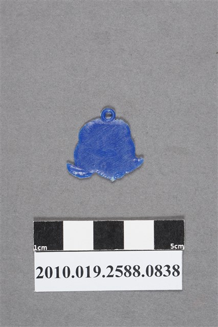 1.本物件為女性頭像尪仔仙。硬質塑膠材質,扁平,單一不透明藍色,單面浮雕圖案。正面圖案為女性斜側面,髮型微捲,髮尾翹起,臉上無特殊表情。頭頂上有小吊環。2.尪仔仙尺寸大致可分成小、中、大型,小型約長2-5公分,中型約長8-15公分,顏色以單色為主。有些大型的則可長達30公分左右,以菩薩、神仙和民間傳說故事人物等造型為主,塗上金銀紅黃彩漆等亮色。1960、70年代的尪仔仙多以民間傳說故事、歌仔戲、布袋戲人物為造型。1980年代改以卡通、電玩、漫畫人物造型為主。常見玩法之一為兩人(或多人)各持一只尪仔仙,輪流用手指彈射,看誰的尪仔仙先疊在對方上面,便可贏得對方用來對戰或是約定的尪仔仙。