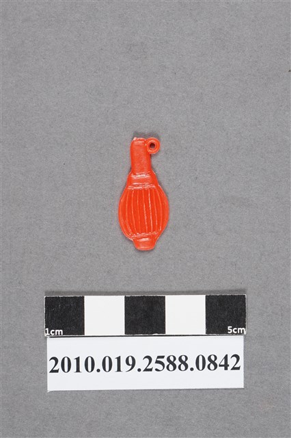 1.本物件為瓶子尪仔仙。硬質塑膠材質,扁平,單一不透明橘紅色,雙面浮雕圖案,兩面圖案相同。圖案為瓶肚呈圓弧型的瓶子,瓶身表面有直條紋。有小吊環。2.尪仔仙尺寸大致可分成小、中、大型,小型約長2-5公分,中型約長8-15公分,顏色以單色為主。有些大型的則可長達30公分左右,以菩薩、神仙和民間傳說故事人物等造型為主,塗上金銀紅黃彩漆等亮色。1960、70年代的尪仔仙多以民間傳說故事、歌仔戲、布袋戲人物為造型。1980年代改以卡通、電玩、漫畫人物造型為主。常見玩法之一為兩人(或多人)各持一只尪仔仙,輪流用手指彈射,看誰的尪仔仙先疊在對方上面,便可贏得對方用來對戰或是約定的尪仔仙。