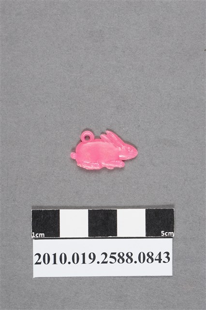 1.本物件為兔子尪仔仙。硬質塑膠材質,扁平,單一不透明粉紅色,雙面浮雕圖案,兩面圖案相同。圖案為長耳朵的兔子,可見眼睛、嘴巴和尾巴。背上有小吊環。2.尪仔仙尺寸大致可分成小、中、大型,小型約長2-5公分,中型約長8-15公分,顏色以單色為主。有些大型的則可長達30公分左右,以菩薩、神仙和民間傳說故事人物等造型為主,塗上金銀紅黃彩漆等亮色。1960、70年代的尪仔仙多以民間傳說故事、歌仔戲、布袋戲人物為造型。1980年代改以卡通、電玩、漫畫人物造型為主。常見玩法之一為兩人(或多人)各持一只尪仔仙,輪流用手指彈射,看誰的尪仔仙先疊在對方上面,便可贏得對方用來對戰或是約定的尪仔仙。