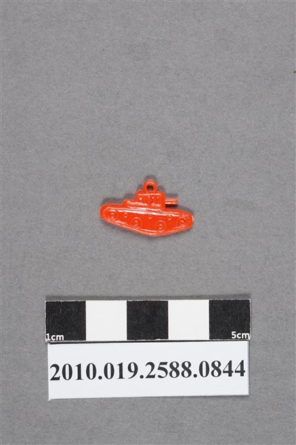 1.本物件為坦克車尪仔仙。硬質塑膠材質,扁平,單一不透明橘紅色,雙面浮雕圖案,兩面圖案相同。圖案為坦克車側面,可見大砲管和履帶。車頂有小吊環。2.尪仔仙尺寸大致可分成小、中、大型,小型約長2-5公分,中型約長8-15公分,顏色以單色為主。有些大型的則可長達30公分左右,以菩薩、神仙和民間傳說故事人物等造型為主,塗上金銀紅黃彩漆等亮色。1960、70年代的尪仔仙多以民間傳說故事、歌仔戲、布袋戲人物為造型。1980年代改以卡通、電玩、漫畫人物造型為主。常見玩法之一為兩人(或多人)各持一只尪仔仙,輪流用手指彈射,看誰的尪仔仙先疊在對方上面,便可贏得對方用來對戰或是約定的尪仔仙。