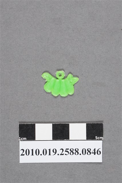 1.本物件為綠色尪仔仙。硬質塑膠材質,扁平,單一不透明綠色,雙面浮雕圖案,兩面圖案相同。難以判斷圖案為何,似一串水果類物品。有小吊環。2.尪仔仙尺寸大致可分成小、中、大型,小型約長2-5公分,中型約長8-15公分,顏色以單色為主。有些大型的則可長達30公分左右,以菩薩、神仙和民間傳說故事人物等造型為主,塗上金銀紅黃彩漆等亮色。1960、70年代的尪仔仙多以民間傳說故事、歌仔戲、布袋戲人物為造型。1980年代改以卡通、電玩、漫畫人物造型為主。常見玩法之一為兩人(或多人)各持一只尪仔仙,輪流用手指彈射,看誰的尪仔仙先疊在對方上面,便可贏得對方用來對戰或是約定的尪仔仙。