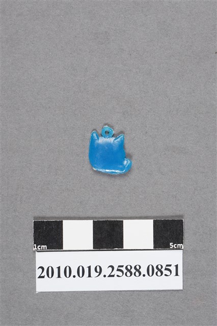 1.本物件為豬頭尪仔仙。硬質塑膠材質,扁平,單一不透明藍色,單面浮雕圖案。正面圖案為小豬頭部側面,臉頰有肉,豬鼻明顯。頭頂有小吊環。2.尪仔仙尺寸大致可分成小、中、大型,小型約長2-5公分,中型約長8-15公分,顏色以單色為主。有些大型的則可長達30公分左右,以菩薩、神仙和民間傳說故事人物等造型為主,塗上金銀紅黃彩漆等亮色。1960、70年代的尪仔仙多以民間傳說故事、歌仔戲、布袋戲人物為造型。1980年代改以卡通、電玩、漫畫人物造型為主。常見玩法之一為兩人(或多人)各持一只尪仔仙,輪流用手指彈射,看誰的尪仔仙先疊在對方上面,便可贏得對方用來對戰或是約定的尪仔仙。