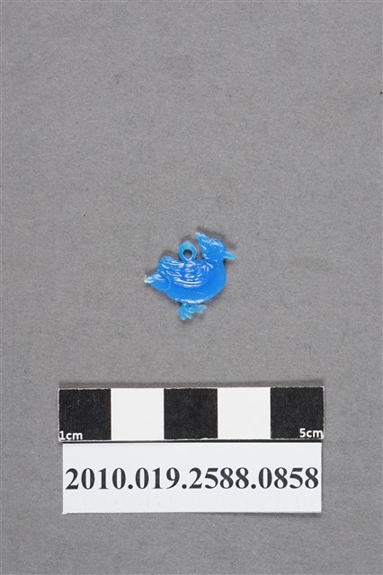 1.本物件為公雞尪仔仙。硬質塑膠材質,扁平,單一不透明藍色,雙面浮雕圖案,兩面圖案相同。圖案為站立的公雞,頭上有雞冠,翅膀收起,雞爪著地。背上有小吊環。2.尪仔仙尺寸大致可分成小、中、大型,小型約長2-5公分,中型約長8-15公分,顏色以單色為主。有些大型的則可長達30公分左右,以菩薩、神仙和民間傳說故事人物等造型為主,塗上金銀紅黃彩漆等亮色。1960、70年代的尪仔仙多以民間傳說故事、歌仔戲、布袋戲人物為造型。1980年代改以卡通、電玩、漫畫人物造型為主。常見玩法之一為兩人(或多人)各持一只尪仔仙,輪流用手指彈射,看誰的尪仔仙先疊在對方上面,便可贏得對方用來對戰或是約定的尪仔仙。