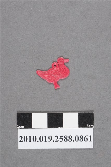 1.本物件為鴨子尪仔仙。硬質塑膠材質,扁平,單一不透明桃紅色,雙面浮雕圖案,兩面圖案相同。圖案為站立的鴨子,扁嘴,脖子短,翅膀收起,尾部羽毛豐盈。背上有小吊環。2.尪仔仙尺寸大致可分成小、中、大型,小型約長2-5公分,中型約長8-15公分,顏色以單色為主。有些大型的則可長達30公分左右,以菩薩、神仙和民間傳說故事人物等造型為主,塗上金銀紅黃彩漆等亮色。1960、70年代的尪仔仙多以民間傳說故事、歌仔戲、布袋戲人物為造型。1980年代改以卡通、電玩、漫畫人物造型為主。常見玩法之一為兩人(或多人)各持一只尪仔仙,輪流用手指彈射,看誰的尪仔仙先疊在對方上面,便可贏得對方用來對戰或是約定的尪仔仙。
