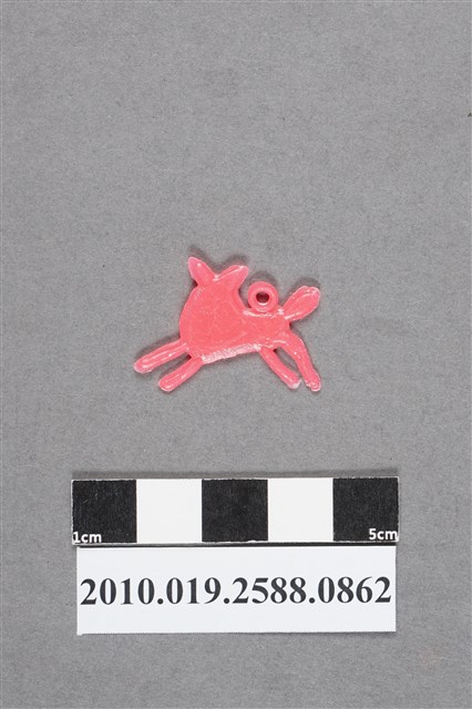 1.本物件為粉紅色狗型尪仔仙。硬質塑膠材質,扁平,單一不透明粉紅色,單面浮雕圖案。正面圖案為趴在地上的狗型動物,頭型和耳型似狗,頭部往身體方向看。背上有小吊環。2.尪仔仙尺寸大致可分成小、中、大型,小型約長2-5公分,中型約長8-15公分,顏色以單色為主。有些大型的則可長達30公分左右,以菩薩、神仙和民間傳說故事人物等造型為主,塗上金銀紅黃彩漆等亮色。1960、70年代的尪仔仙多以民間傳說故事、歌仔戲、布袋戲人物為造型。1980年代改以卡通、電玩、漫畫人物造型為主。常見玩法之一為兩人(或多人)各持一只尪仔仙,輪流用手指彈射,看誰的尪仔仙先疊在對方上面,便可贏得對方用來對戰或是約定的尪仔仙。