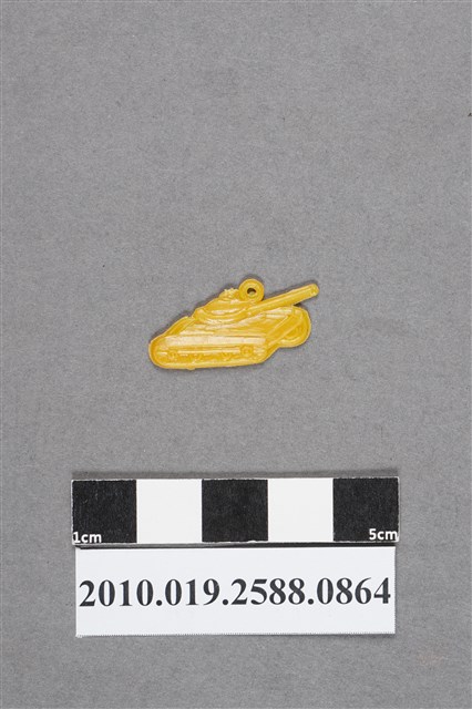 1.本物件為坦克車尪仔仙。硬質塑膠材質,扁平,單一不透明黃色,雙面浮雕圖案,兩面圖案相同。圖案為坦克車斜側面,可見大砲管、履帶以及車頭部位。車頂有小吊環。2.尪仔仙尺寸大致可分成小、中、大型,小型約長2-5公分,中型約長8-15公分,顏色以單色為主。有些大型的則可長達30公分左右,以菩薩、神仙和民間傳說故事人物等造型為主,塗上金銀紅黃彩漆等亮色。1960、70年代的尪仔仙多以民間傳說故事、歌仔戲、布袋戲人物為造型。1980年代改以卡通、電玩、漫畫人物造型為主。常見玩法之一為兩人(或多人)各持一只尪仔仙,輪流用手指彈射,看誰的尪仔仙先疊在對方上面,便可贏得對方用來對戰或是約定的尪仔仙。