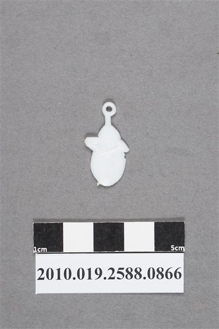 1.本物件為玉米尪仔仙(玉蜀黍)。硬質塑膠材質,扁平,單一不透明白色,雙面浮雕圖案,兩面圖案相同。圖案為有包葉的玉米,上半截可見玉米顆粒,下半截被葉子包起來。有小吊環。2.尪仔仙尺寸大致可分成小、中、大型,小型約長2-5公分,中型約長8-15公分,顏色以單色為主。有些大型的則可長達30公分左右,以菩薩、神仙和民間傳說故事人物等造型為主,塗上金銀紅黃彩漆等亮色。1960、70年代的尪仔仙多以民間傳說故事、歌仔戲、布袋戲人物為造型。1980年代改以卡通、電玩、漫畫人物造型為主。常見玩法之一為兩人(或多人)各持一只尪仔仙,輪流用手指彈射,看誰的尪仔仙先疊在對方上面,便可贏得對方用來對戰或是約定的尪仔仙。