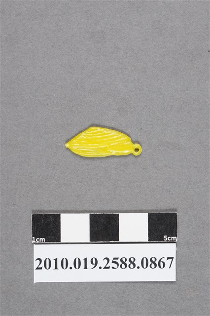 1.本物件為蚌殼尪仔仙。硬質塑膠材質,扁平,單一不透明黃色,雙面浮雕圖案,兩面圖案相同。圖案為殼合起來但露出一小塊肉的蚌殼,殼上有圈形紋路。有小吊環。2.尪仔仙尺寸大致可分成小、中、大型,小型約長2-5公分,中型約長8-15公分,顏色以單色為主。有些大型的則可長達30公分左右,以菩薩、神仙和民間傳說故事人物等造型為主,塗上金銀紅黃彩漆等亮色。1960、70年代的尪仔仙多以民間傳說故事、歌仔戲、布袋戲人物為造型。1980年代改以卡通、電玩、漫畫人物造型為主。常見玩法之一為兩人(或多人)各持一只尪仔仙,輪流用手指彈射,看誰的尪仔仙先疊在對方上面,便可贏得對方用來對戰或是約定的尪仔仙。