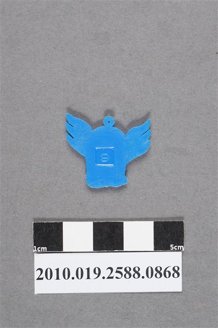 1.本物件為怪物頭像尪仔仙。硬質塑膠材質,扁平,單一不透明藍色,單面浮雕圖案。正面圖案為面具式頭盔頭像,頭盔兩旁有翅嗙造型的裝飾物,可見頭盔下的眼睛。頭頂有小吊環,背面有9之陽刻字樣,是系列尪仔仙。2.尪仔仙尺寸大致可分成小、中、大型,小型約長2-5公分,中型約長8-15公分,顏色以單色為主。有些大型的則可長達30公分左右,以菩薩、神仙和民間傳說故事人物等造型為主,塗上金銀紅黃彩漆等亮色。1960、70年代的尪仔仙多以民間傳說故事、歌仔戲、布袋戲人物為造型。1980年代改以卡通、電玩、漫畫人物造型為主。常見玩法之一為兩人(或多人)各持一只尪仔仙,輪流用手指彈射,看誰的尪仔仙先疊在對方上面,便可贏得對方用來對戰或是約定的尪仔仙。