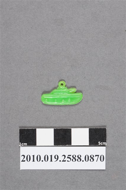 1.本物件為坦克車尪仔仙。硬質塑膠材質,扁平,單一不透明綠色,雙面浮雕圖案,兩面圖案相同。圖案為坦克車側面,可見大砲管和履帶。車頂有小吊環。2.尪仔仙尺寸大致可分成小、中、大型,小型約長2-5公分,中型約長8-15公分,顏色以單色為主。有些大型的則可長達30公分左右,以菩薩、神仙和民間傳說故事人物等造型為主,塗上金銀紅黃彩漆等亮色。1960、70年代的尪仔仙多以民間傳說故事、歌仔戲、布袋戲人物為造型。1980年代改以卡通、電玩、漫畫人物造型為主。常見玩法之一為兩人(或多人)各持一只尪仔仙,輪流用手指彈射,看誰的尪仔仙先疊在對方上面,便可贏得對方用來對戰或是約定的尪仔仙。