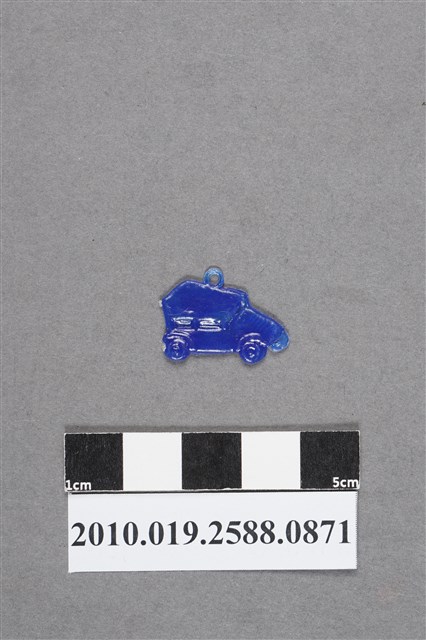 1.本物件為汽車尪仔仙。硬質塑膠材質,扁平,單一不透明藍色,雙面浮雕圖案,兩面圖案相同。圖案為沒有後車箱的汽車,車廂方正,為復古車型。車頂有小吊環。2.尪仔仙尺寸大致可分成小、中、大型,小型約長2-5公分,中型約長8-15公分,顏色以單色為主。有些大型的則可長達30公分左右,以菩薩、神仙和民間傳說故事人物等造型為主,塗上金銀紅黃彩漆等亮色。1960、70年代的尪仔仙多以民間傳說故事、歌仔戲、布袋戲人物為造型。1980年代改以卡通、電玩、漫畫人物造型為主。常見玩法之一為兩人(或多人)各持一只尪仔仙,輪流用手指彈射,看誰的尪仔仙先疊在對方上面,便可贏得對方用來對戰或是約定的尪仔仙。