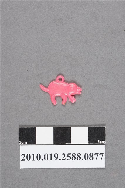 1.本物件為粉紅色動物尪仔仙。硬質塑膠材質,扁平,單一不透明粉紅色,雙面浮雕圖案,兩面圖案相同。圖案似牲畜類動物,可見嘴巴和眼睛,有尾巴和3隻腳。背上有小吊環。2.尪仔仙尺寸大致可分成小、中、大型,小型約長2-5公分,中型約長8-15公分,顏色以單色為主。有些大型的則可長達30公分左右,以菩薩、神仙和民間傳說故事人物等造型為主,塗上金銀紅黃彩漆等亮色。1960、70年代的尪仔仙多以民間傳說故事、歌仔戲、布袋戲人物為造型。1980年代改以卡通、電玩、漫畫人物造型為主。常見玩法之一為兩人(或多人)各持一只尪仔仙,輪流用手指彈射,看誰的尪仔仙先疊在對方上面,便可贏得對方用來對戰或是約定的尪仔仙。