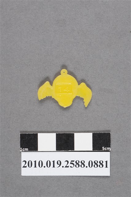 1.本物件為怪物頭像尪仔仙。硬質塑膠材質,扁平,單一不透明黃色,單面浮雕圖案。正面圖案為有紋路的怪物臉部,額頭中間有骷髏頭圖案,臉部兩側長有翅膀形狀的東西,張嘴可見牙齒。頭頂有小吊環,背面有14之陽刻字樣,是系列尪仔仙。2.尪仔仙尺寸大致可分成小、中、大型,小型約長2-5公分,中型約長8-15公分,顏色以單色為主。有些大型的則可長達30公分左右,以菩薩、神仙和民間傳說故事人物等造型為主,塗上金銀紅黃彩漆等亮色。1960、70年代的尪仔仙多以民間傳說故事、歌仔戲、布袋戲人物為造型。1980年代改以卡通、電玩、漫畫人物造型為主。常見玩法之一為兩人(或多人)各持一只尪仔仙,輪流用手指彈射,看誰的尪仔仙先疊在對方上面,便可贏得對方用來對戰或是約定的尪仔仙。