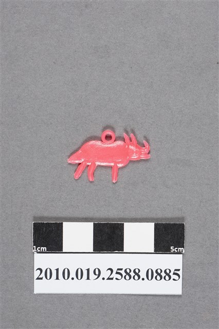 1.本物件為粉紅色牛型尪仔仙。硬質塑膠材質,扁平,單一不透明粉紅色,雙面浮雕圖案,兩面圖案相同。圖案似站立的牛隻,耳朵或頭角豎起,嘴型奇怪,僅見3隻腳。背上有小吊環。2.尪仔仙尺寸大致可分成小、中、大型,小型約長2-5公分,中型約長8-15公分,顏色以單色為主。有些大型的則可長達30公分左右,以菩薩、神仙和民間傳說故事人物等造型為主,塗上金銀紅黃彩漆等亮色。1960、70年代的尪仔仙多以民間傳說故事、歌仔戲、布袋戲人物為造型。1980年代改以卡通、電玩、漫畫人物造型為主。常見玩法之一為兩人(或多人)各持一只尪仔仙,輪流用手指彈射,看誰的尪仔仙先疊在對方上面,便可贏得對方用來對戰或是約定的尪仔仙。