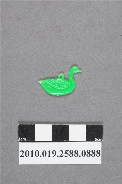 1.本物件為鵝尪仔仙。硬質塑膠材質,扁平,單一不透明綠色,雙面浮雕圖案,兩面圖案相同。圖案為鵝隻側面,喙短尖,似在游水,翅膀收在身旁,不見雙腳。背上有小吊環。2.尪仔仙尺寸大致可分成小、中、大型,小型約長2-5公分,中型約長8-15公分,顏色以單色為主。有些大型的則可長達30公分左右,以菩薩、神仙和民間傳說故事人物等造型為主,塗上金銀紅黃彩漆等亮色。1960、70年代的尪仔仙多以民間傳說故事、歌仔戲、布袋戲人物為造型。1980年代改以卡通、電玩、漫畫人物造型為主。常見玩法之一為兩人(或多人)各持一只尪仔仙,輪流用手指彈射,看誰的尪仔仙先疊在對方上面,便可贏得對方用來對戰或是約定的尪仔仙。