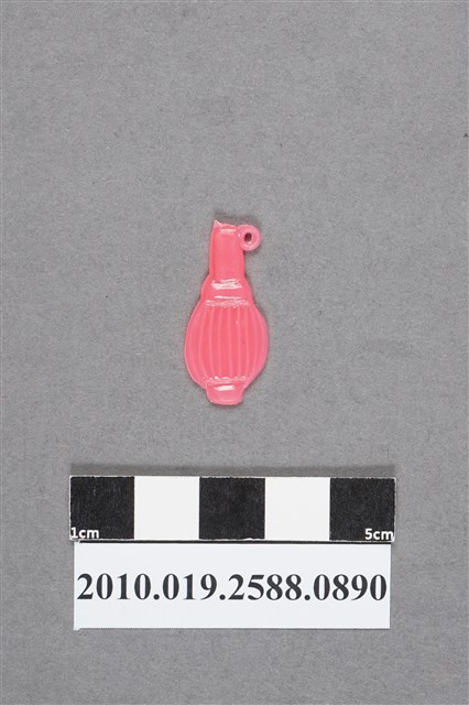 1.本物件為瓶子尪仔仙。硬質塑膠材質,扁平,單一不透明粉紅色,雙面浮雕圖案,兩面圖案相同。圖案為瓶肚呈圓弧型的瓶子,瓶身表面有直條紋。有小吊環。2.尪仔仙尺寸大致可分成小、中、大型,小型約長2-5公分,中型約長8-15公分,顏色以單色為主。有些大型的則可長達30公分左右,以菩薩、神仙和民間傳說故事人物等造型為主,塗上金銀紅黃彩漆等亮色。1960、70年代的尪仔仙多以民間傳說故事、歌仔戲、布袋戲人物為造型。1980年代改以卡通、電玩、漫畫人物造型為主。常見玩法之一為兩人(或多人)各持一只尪仔仙,輪流用手指彈射,看誰的尪仔仙先疊在對方上面,便可贏得對方用來對戰或是約定的尪仔仙。