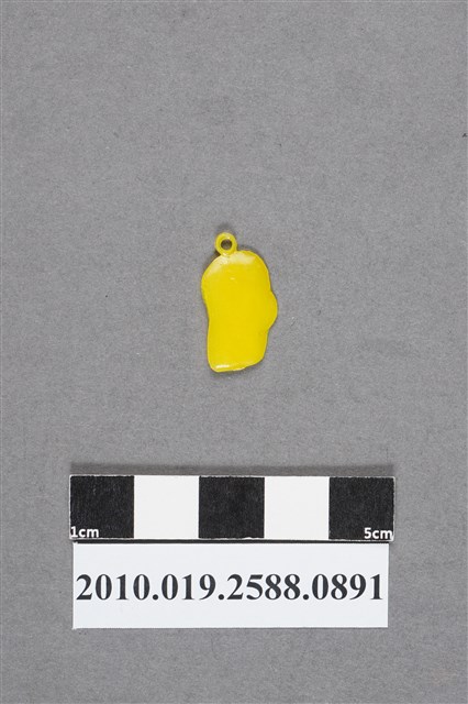 1.本物件為男性頭像尪仔仙。硬質塑膠材質,扁平,單一不透明黃色,單面浮雕圖案。正面圖案為下巴方正且有戽斗臉型的男性頭像,短髮,可見五官。頭頂上有小吊環。2.尪仔仙尺寸大致可分成小、中、大型,小型約長2-5公分,中型約長8-15公分,顏色以單色為主。有些大型的則可長達30公分左右,以菩薩、神仙和民間傳說故事人物等造型為主,塗上金銀紅黃彩漆等亮色。1960、70年代的尪仔仙多以民間傳說故事、歌仔戲、布袋戲人物為造型。1980年代改以卡通、電玩、漫畫人物造型為主。常見玩法之一為兩人(或多人)各持一只尪仔仙,輪流用手指彈射,看誰的尪仔仙先疊在對方上面,便可贏得對方用來對戰或是約定的尪仔仙。