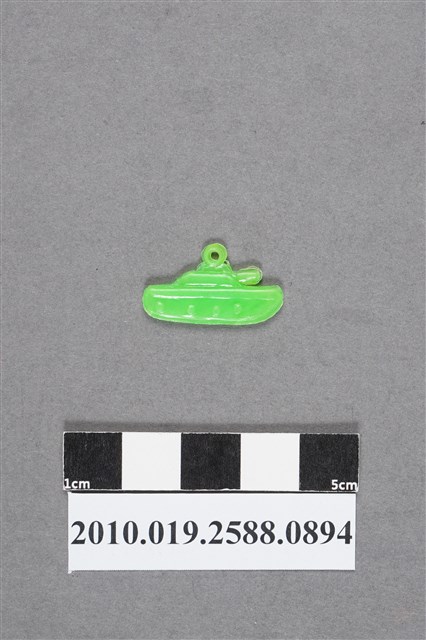 1.本物件為坦克車尪仔仙。硬質塑膠材質,扁平,單一不透明綠色,雙面浮雕圖案,兩面圖案相同。圖案為坦克車側面,可見大砲管和履帶。車頂有小吊環。2.尪仔仙尺寸大致可分成小、中、大型,小型約長2-5公分,中型約長8-15公分,顏色以單色為主。有些大型的則可長達30公分左右,以菩薩、神仙和民間傳說故事人物等造型為主,塗上金銀紅黃彩漆等亮色。1960、70年代的尪仔仙多以民間傳說故事、歌仔戲、布袋戲人物為造型。1980年代改以卡通、電玩、漫畫人物造型為主。常見玩法之一為兩人(或多人)各持一只尪仔仙,輪流用手指彈射,看誰的尪仔仙先疊在對方上面,便可贏得對方用來對戰或是約定的尪仔仙。