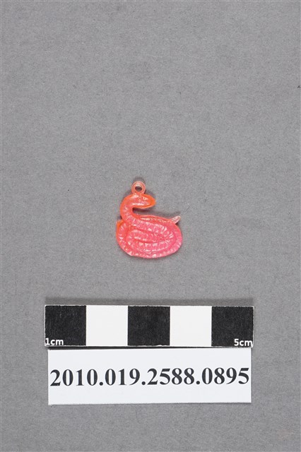 1.本物件為蛇尪仔仙。硬質塑膠材質,扁平,單一不透明粉紅色,雙面浮雕圖案,兩面圖案相同。圖案為身體蜷曲成圈狀的蛇,蛇頭立起,身體有鱗片。頭頂有小吊環。2.尪仔仙尺寸大致可分成小、中、大型,小型約長2-5公分,中型約長8-15公分,顏色以單色為主。有些大型的則可長達30公分左右,以菩薩、神仙和民間傳說故事人物等造型為主,塗上金銀紅黃彩漆等亮色。1960、70年代的尪仔仙多以民間傳說故事、歌仔戲、布袋戲人物為造型。1980年代改以卡通、電玩、漫畫人物造型為主。常見玩法之一為兩人(或多人)各持一只尪仔仙,輪流用手指彈射,看誰的尪仔仙先疊在對方上面,便可贏得對方用來對戰或是約定的尪仔仙。