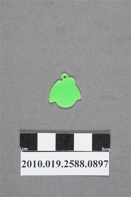 1.本物件為女性頭像尪仔仙。硬質塑膠材質,扁平,單一不透明綠色,雙面浮雕圖案。正面圖案為髮長到耳下並蓋住耳朵的女性頭像,頭上別有1朵花。頭頂有小吊環。