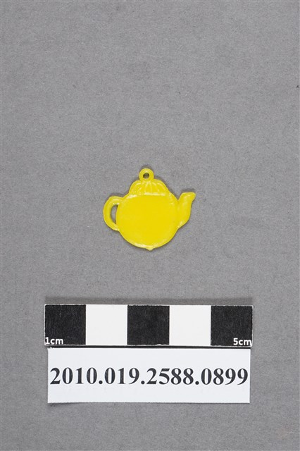 1.本物件為水壺尪仔仙。硬質塑膠材質,扁平,單一不透明黃色,雙面浮雕圖案,兩面圖案相同。圖案為圓身水壺,可見壺嘴和把手,壺蓋上有條紋。有小吊環。2.尪仔仙尺寸大致可分成小、中、大型,小型約長2-5公分,中型約長8-15公分,顏色以單色為主。有些大型的則可長達30公分左右,以菩薩、神仙和民間傳說故事人物等造型為主,塗上金銀紅黃彩漆等亮色。1960、70年代的尪仔仙多以民間傳說故事、歌仔戲、布袋戲人物為造型。1980年代改以卡通、電玩、漫畫人物造型為主。常見玩法之一為兩人(或多人)各持一只尪仔仙,輪流用手指彈射,看誰的尪仔仙先疊在對方上面,便可贏得對方用來對戰或是約定的尪仔仙。