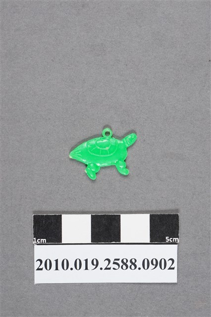 1.本物件為烏龜尪仔仙。硬質塑膠材質,扁平,單一不透明綠色,雙面浮雕圖案,兩面圖案相同。圖案為頭向上抬起的烏龜,可見龜殼紋路,無明顯尾巴。比起正常烏龜體型,腳型略長。背上有小吊環。2.尪仔仙尺寸大致可分成小、中、大型,小型約長2-5公分,中型約長8-15公分,顏色以單色為主。有些大型的則可長達30公分左右,以菩薩、神仙和民間傳說故事人物等造型為主,塗上金銀紅黃彩漆等亮色。1960、70年代的尪仔仙多以民間傳說故事、歌仔戲、布袋戲人物為造型。1980年代改以卡通、電玩、漫畫人物造型為主。常見玩法之一為兩人(或多人)各持一只尪仔仙,輪流用手指彈射,看誰的尪仔仙先疊在對方上面,便可贏得對方用來對戰或是約定的尪仔仙。