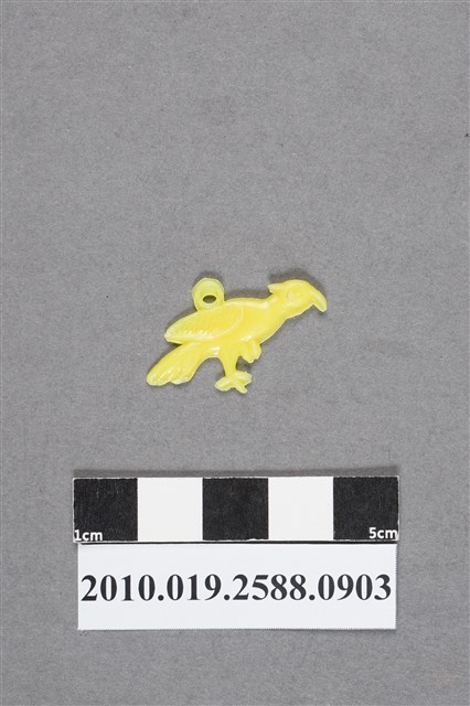 1.本物件為鸚鵡尪仔仙。硬質塑膠材質,扁平,單一不透明黃色,雙面浮雕圖案,兩面圖案相同。圖案為站立的鸚鵡,其頭部後方有羽毛向後長,翅膀收起,尾部羽毛長,單腳站立。背上有小吊環。2.尪仔仙尺寸大致可分成小、中、大型,小型約長2-5公分,中型約長8-15公分,顏色以單色為主。有些大型的則可長達30公分左右,以菩薩、神仙和民間傳說故事人物等造型為主,塗上金銀紅黃彩漆等亮色。1960、70年代的尪仔仙多以民間傳說故事、歌仔戲、布袋戲人物為造型。1980年代改以卡通、電玩、漫畫人物造型為主。常見玩法之一為兩人(或多人)各持一只尪仔仙,輪流用手指彈射,看誰的尪仔仙先疊在對方上面,便可贏得對方用來對戰或是約定的尪仔仙。
