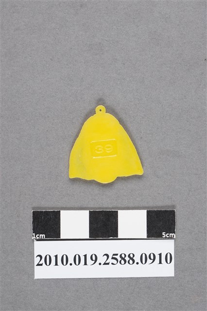 1.本物件為怪物頭像尪仔仙。硬質塑膠材質,扁平,單一不透明黃色,單面浮雕圖案。正面圖案為似眼鏡蛇頭的怪物頭像,皮膚表面為蛇皮紋路,眼睛細長,開嘴可見尖牙。頭頂有小吊環,背面有39之陽刻字樣,是系列尪仔仙。2.尪仔仙尺寸大致可分成小、中、大型,小型約長2-5公分,中型約長8-15公分,顏色以單色為主。有些大型的則可長達30公分左右,以菩薩、神仙和民間傳說故事人物等造型為主,塗上金銀紅黃彩漆等亮色。1960、70年代的尪仔仙多以民間傳說故事、歌仔戲、布袋戲人物為造型。1980年代改以卡通、電玩、漫畫人物造型為主。常見玩法之一為兩人(或多人)各持一只尪仔仙,輪流用手指彈射,看誰的尪仔仙先疊在對方上面,便可贏得對方用來對戰或是約定的尪仔仙。