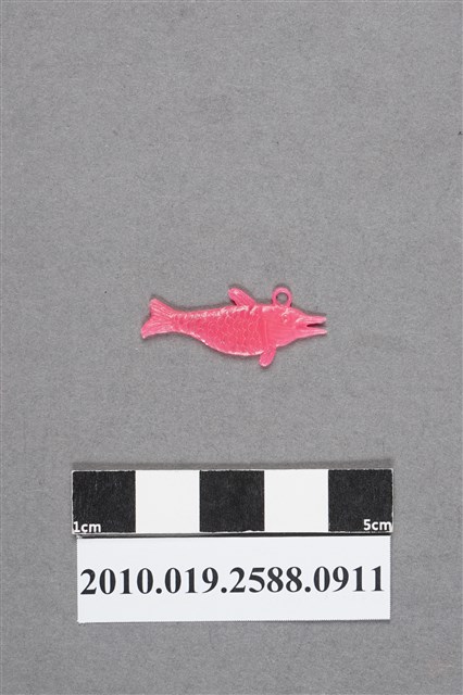 1.本物件為小魚尪仔仙。硬質塑膠材質,扁平,單一不透明粉紅色,雙面浮雕圖案,兩面圖案相同。圖案為嘴巴張開的魚,有胸、背和尾鰭,無腹鰭,腹部大,身上有鱗片。有小吊環。2.尪仔仙尺寸大致可分成小、中、大型,小型約長2-5公分,中型約長8-15公分,顏色以單色為主。有些大型的則可長達30公分左右,以菩薩、神仙和民間傳說故事人物等造型為主,塗上金銀紅黃彩漆等亮色。1960、70年代的尪仔仙多以民間傳說故事、歌仔戲、布袋戲人物為造型。1980年代改以卡通、電玩、漫畫人物造型為主。常見玩法之一為兩人(或多人)各持一只尪仔仙,輪流用手指彈射,看誰的尪仔仙先疊在對方上面,便可贏得對方用來對戰或是約定的尪仔仙。