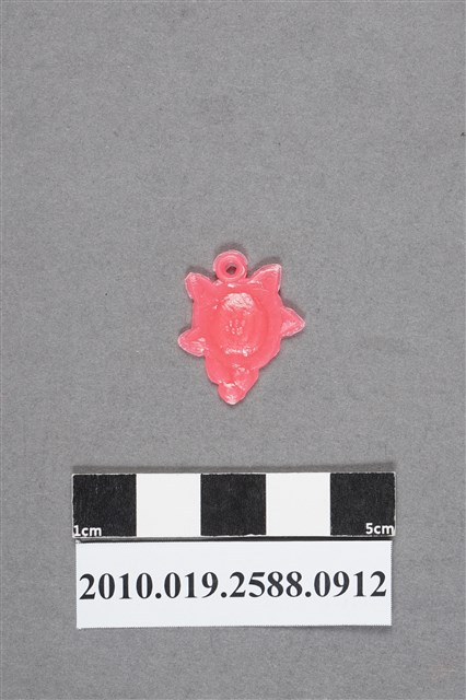 1.本物件為花朵尪仔仙。硬質塑膠材質,扁平,單一不透明粉紅色,雙面浮雕圖案,兩面圖案相同。圖案為有花萼的花朵,中間有花蕊,周圍有4片花瓣。有小吊環。2.尪仔仙尺寸大致可分成小、中、大型,小型約長2-5公分,中型約長8-15公分,顏色以單色為主。有些大型的則可長達30公分左右,以菩薩、神仙和民間傳說故事人物等造型為主,塗上金銀紅黃彩漆等亮色。1960、70年代的尪仔仙多以民間傳說故事、歌仔戲、布袋戲人物為造型。1980年代改以卡通、電玩、漫畫人物造型為主。常見玩法之一為兩人(或多人)各持一只尪仔仙,輪流用手指彈射,看誰的尪仔仙先疊在對方上面,便可贏得對方用來對戰或是約定的尪仔仙。