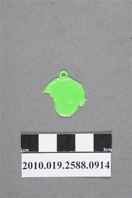 1.本物件為戴帽頭像尪仔仙。硬質塑膠材質,扁平,單一不透明綠色,單面浮雕圖案。正面圖案為男性頭像,頭上戴著帽子,帽頂下垂呈斜面,帽邊明顯。帽頂有小吊環。2.尪仔仙尺寸大致可分成小、中、大型,小型約長2-5公分,中型約長8-15公分,顏色以單色為主。有些大型的則可長達30公分左右,以菩薩、神仙和民間傳說故事人物等造型為主,塗上金銀紅黃彩漆等亮色。1960、70年代的尪仔仙多以民間傳說故事、歌仔戲、布袋戲人物為造型。1980年代改以卡通、電玩、漫畫人物造型為主。常見玩法之一為兩人(或多人)各持一只尪仔仙,輪流用手指彈射,看誰的尪仔仙先疊在對方上面,便可贏得對方用來對戰或是約定的尪仔仙。