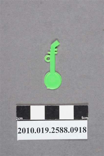 1.本物件為月琴尪仔仙。硬質塑膠材質,扁平,單一不透明綠色,單面浮雕圖案。正面圖案為2條絃有圓形音箱的樂器,形態為月琴的撥弦樂器,琴柄上有琴軸。有小吊環。2.尪仔仙尺寸大致可分成小、中、大型,小型約長2-5公分,中型約長8-15公分,顏色以單色為主。有些大型的則可長達30公分左右,以菩薩、神仙和民間傳說故事人物等造型為主,塗上金銀紅黃彩漆等亮色。1960、70年代的尪仔仙多以民間傳說故事、歌仔戲、布袋戲人物為造型。1980年代改以卡通、電玩、漫畫人物造型為主。常見玩法之一為兩人(或多人)各持一只尪仔仙,輪流用手指彈射,看誰的尪仔仙先疊在對方上面,便可贏得對方用來對戰或是約定的尪仔仙。